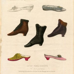 19th-century engraving of a woman in a white ruffled dress and poke bonnet walking with a man in a blue tailcoat and black top hat.