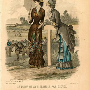 1881 French fashion plate of two women in Victorian seaside gowns and hats on a beach. La Moda de la Elegancia Parisiense illustration.