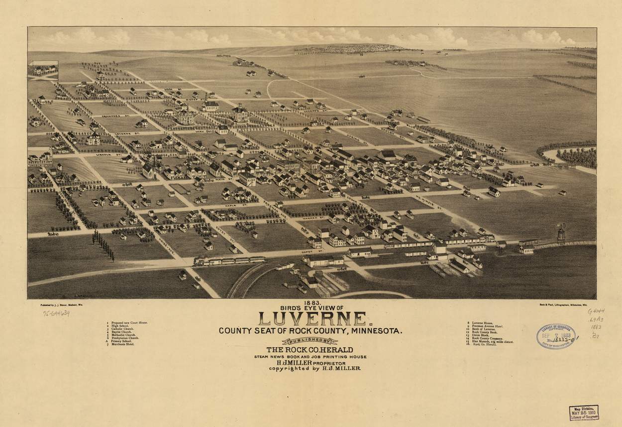 1883 bird’s eye view of Luverne. County seat of Rock County, Minnesota.