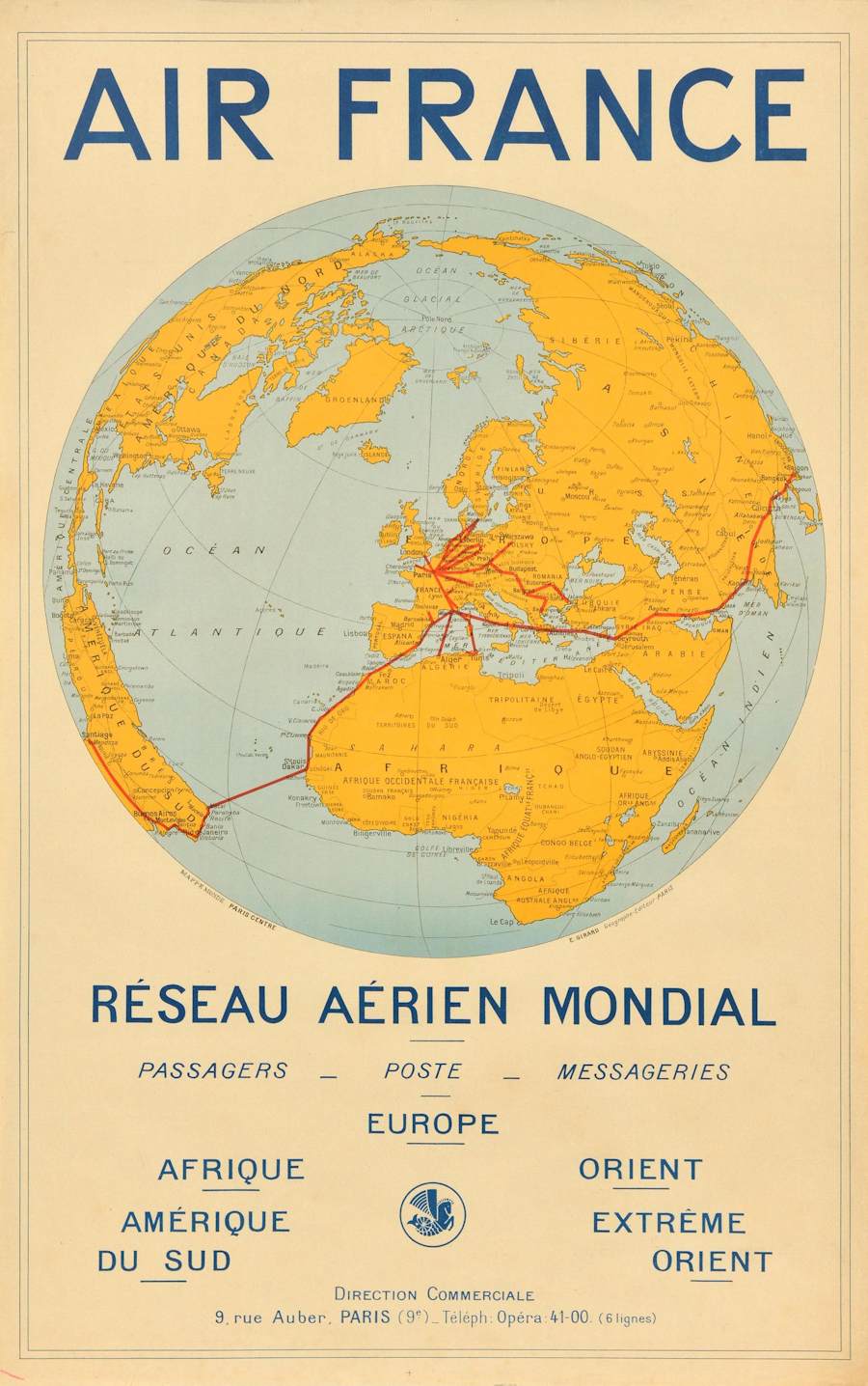 The original poster was created around 1934. The airline Air France was formed in 1933, and this was one of the first global route maps they released. There are other similar versions, some dated 1937 or 1938, but the version depicted in the image is the initial one.