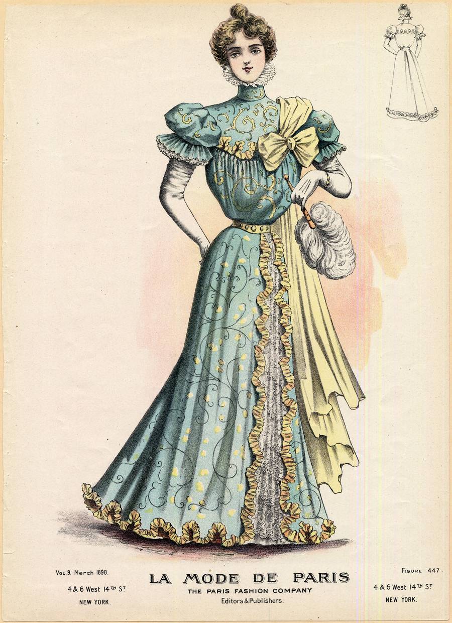 A woman is wearing a light blue-green dress with yellow designs and yellow ruched trimming. The dress has a high neck with a white frill and short puffed sleeves with white frills under the ruffled edges. The bodice has a curved yoke, extending the line of the sleeves, and trimmed with a squiggle of yellow ruching around the yoke.