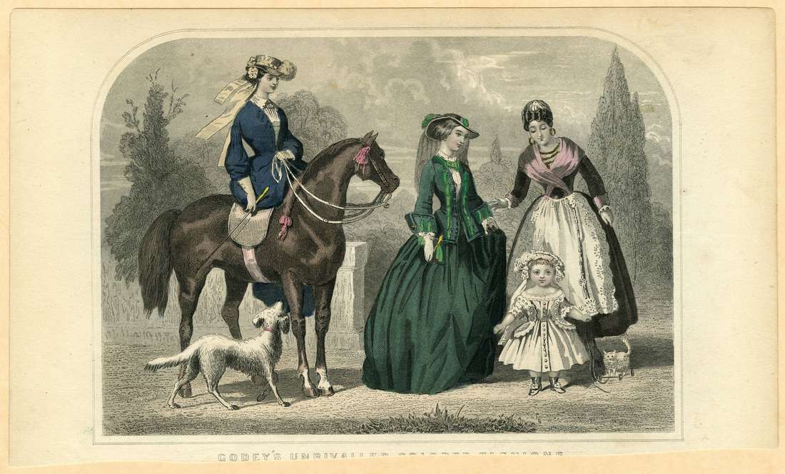 Two women dresses for riding, one on horseback, are joined by the nanny bringing a child to meet them. The woman on the left rides side-saddle on a brown horse whose bridle is adorned with a pink tassel and whose mane is braided with a pink bow. A white dog with a pink collar greets her. The woman wears a blue riding habit with a white pleated blouse with a wide stiff collar, a blue skirt, and blue jacket open in a deep v.