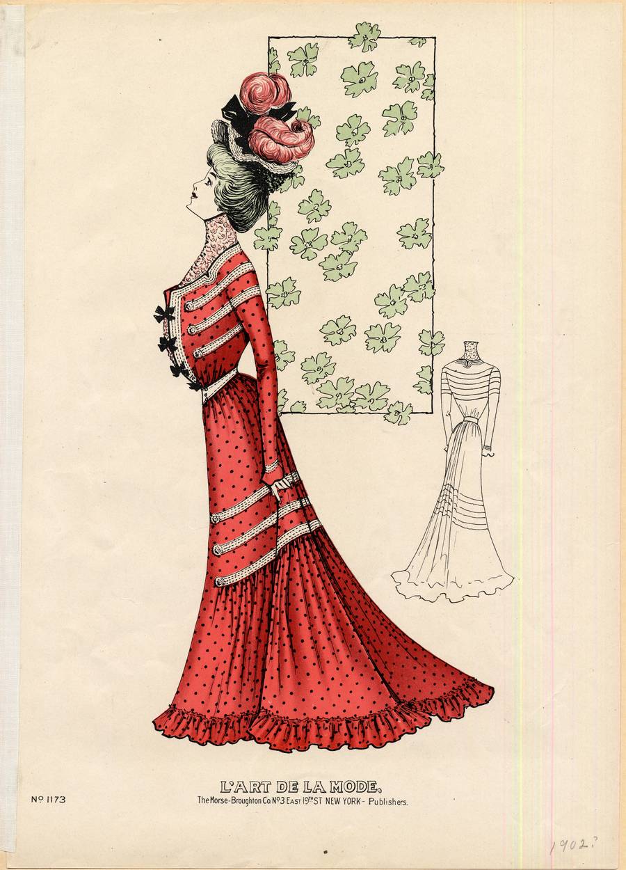 A woman facing left in a long-sleeved dress of red with black polka dots. The bodice and skirt are trimmed with three white horizontal bands with black stitching that end at the front with round ornaments. The upper two bands on the bodice are extended visually onto the upper sleeves. The sleeves are narrow and close fitting, with a narrow ruffle at the wrist below another white band. The waistband or belt is also white. Under the bodice she wears a very high necked brocade patterned white and pink blouse.