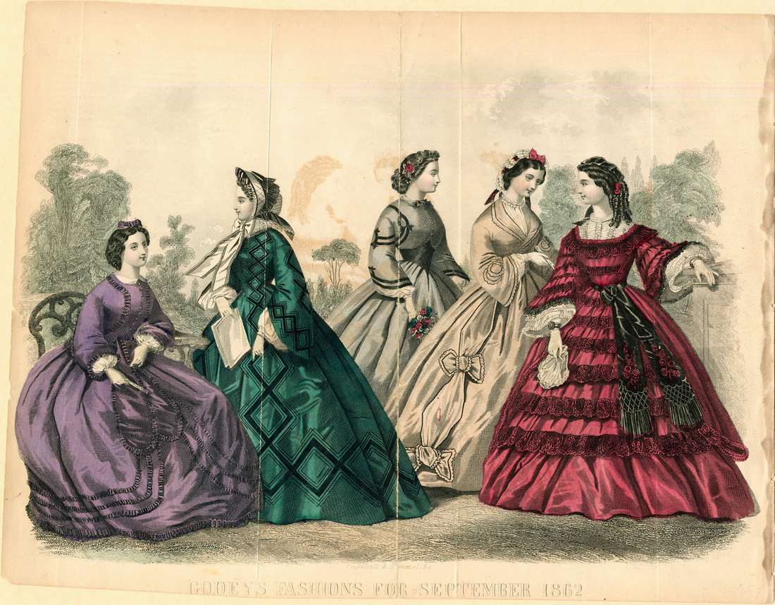 Five women are depicted outside. The woman on the left wears a purple bow in her hair that matches the color of her dress. Her dress has a white collar and long sleeves. There are rows of ruffles along her bodice and down her skirt. She also has a tie around her waist with long lappet ends which are edged with ruffles. She holds a fan in her right hand. The woman next to her stands and wears a white bonnet with black lace and a white ribbon.