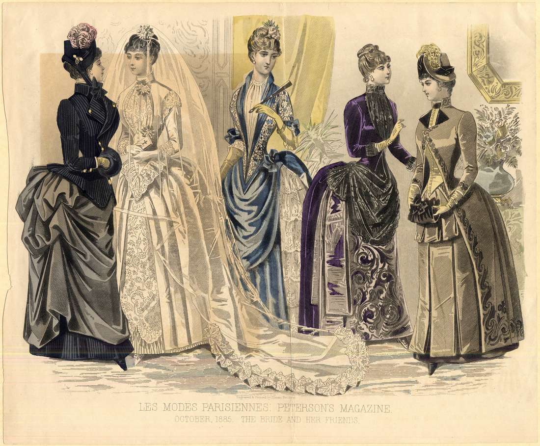 She wears a black hat with a pink plume, black ribbons, and a gold ornament at the side. The second woman is the bride. She wears a high-collared white satin bridal gown with a long train. She wears her hair up with a floral ornament on top, and a long veil over all. The dress has a standing collar edged with a very narrow ruffle, long narrow sleeves with lace cuffs and lace sleeve caps, and a pointed bodice. The bodice has lace at the center front, two small orange blossom corsages, one worn at the collar and one at the waist on the left side, and small buttons at the center front at the waist section which is pointed on top and bottom and edged with a wide lace ruffle. Her underskirt is lace with a tasseled trim over a narrow pleated band, and the overskirt has wide vertical pleats all round. She wears gloves and holds a small Bible or prayer book.