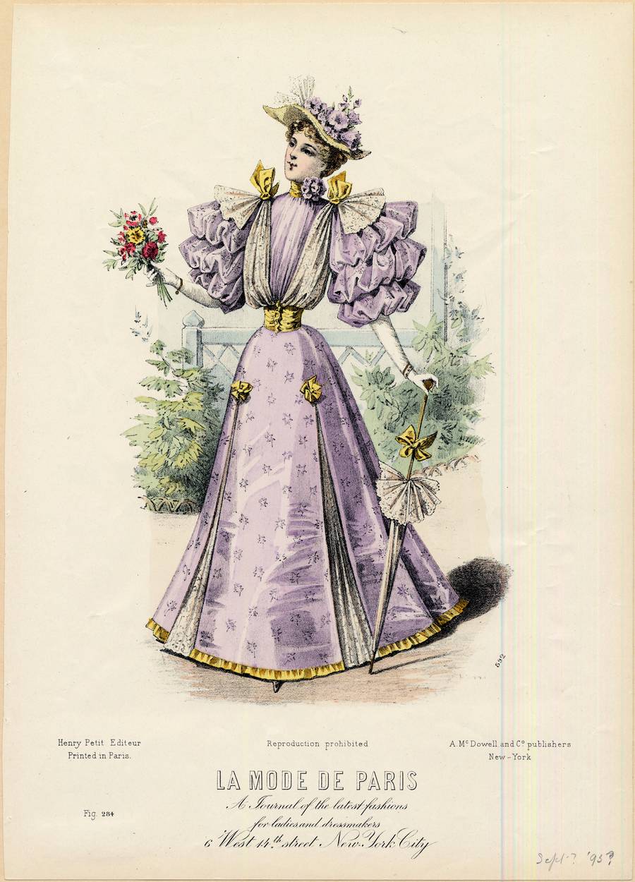 A woman is standing in a garden holding a bouquet of yellow and red flowers. She wears a lavender dress with yellow trimming. The sleeves are three tiers of gathers creating full puffed sleeves with gathered lace epaulettes. The bodice is high necked with vertical gathers and two bands of lace at the sides with bright yellow bows at the shoulders. The collar is yellow, with a lavender rosette at the side. She has a gathered yellow waist with a ruffle.