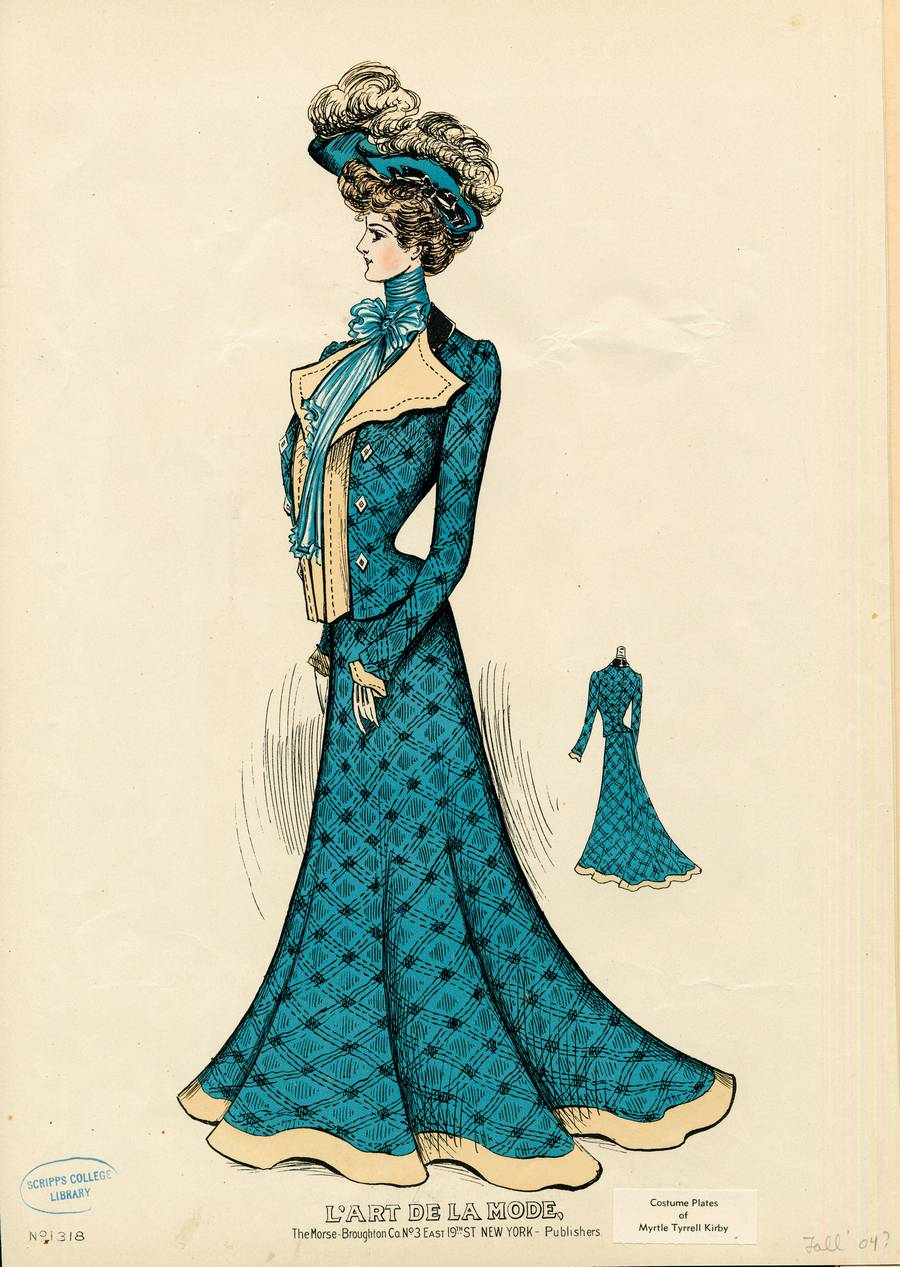 She wears a diaphanous turquoise blouse with a very high collar, and a bow at the neck, with long hanging ruffled ends. The skirt is gored, flaring into a trumpet shape with a slight train. She wears white gloves and a turquoise hat with tan ostrich feathers and a black bow on the upturned brim. behind at the right is a small back view of the suit.