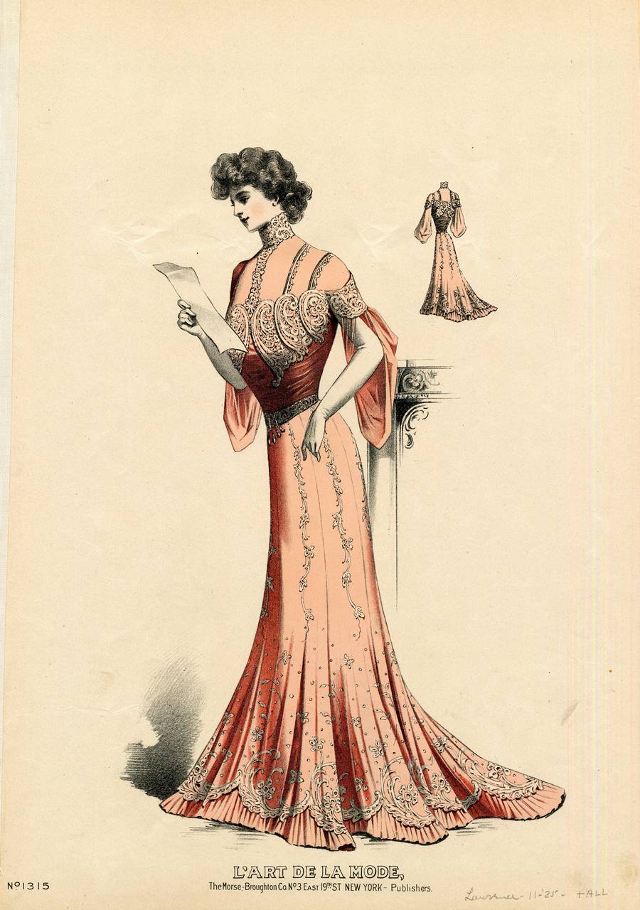 A young woman is dressed for the evening in ball gown She stands in a three-quarter profile view and leans against the mantle of a (suggested) fireplace. The scroll-work on the fireplace indicates a well-appointed home where the young woman holds a sheet of paper, which might be a sheet of music, a letter, a menu, or a program.