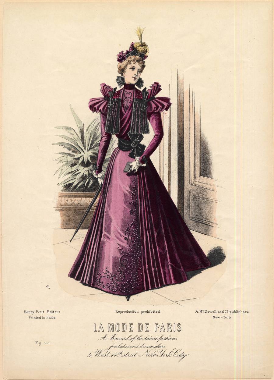 A wide black sash with a large bow on the left creates the waist of the gown. She wears white gloves, and holds a very small back book in one hand and her furled black umbrella in the other. Her hat is small and decorated with maroon and black bows, gold plumes and egret feathers. Behind her is a door and a potted palm.