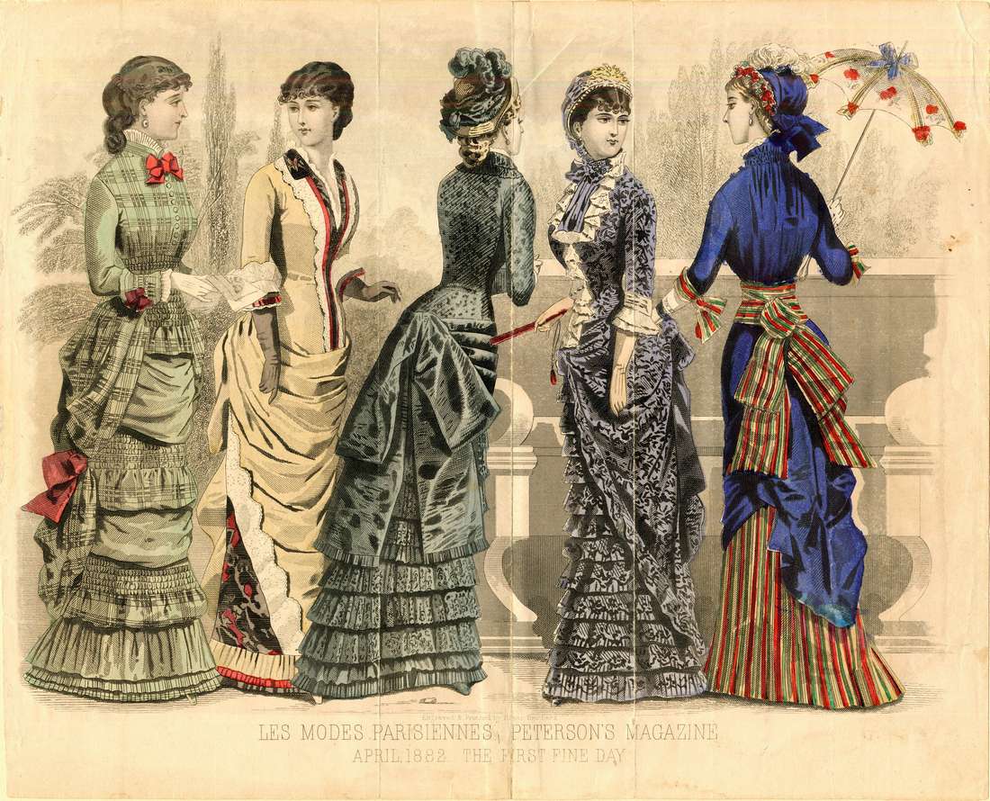 Five women stand on a porch conversing with each other. The woman on the far left wears her hair dressed back in a loose twist at the neck with bangs. She wears oval pendant earrings. Her green plaid dress has a high collar and long sleeves. There are rose red bows at her collar, sleeve cuffs, and at her hips. There are buttons down her bodice front and ruching at her waist. Her skirt has ruffled and draped sections, some in plain green and some in the green and brown plaid. The next woman wears her hair dressed softly back, with curled bangs. Her yellow dress dress has a v-neck and three-quarter length sleeves.
