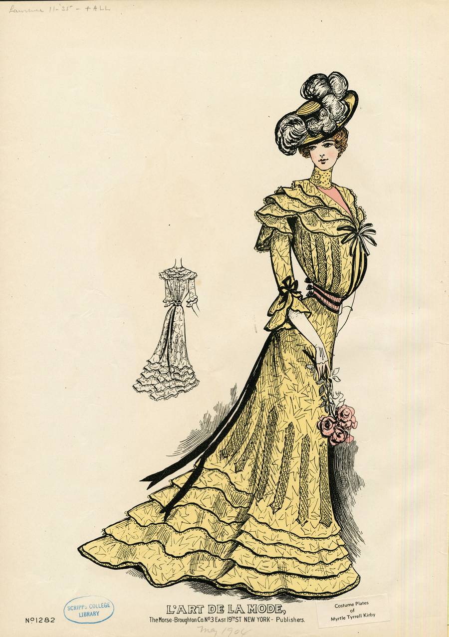 This illustration of dress No. 1282 is on the reverse plate of dress No. 1285 of L’Art de la Mode from the Morse-Broughton Co, New York, “American May 1904.” The drawing is much less rendered and printed with a different, less expensive-looking process. The model stands in three-quarter view with her face turned toward the viewer as she displays her yellow gown, with an all over pattern of leaves, or abstract flowers.
