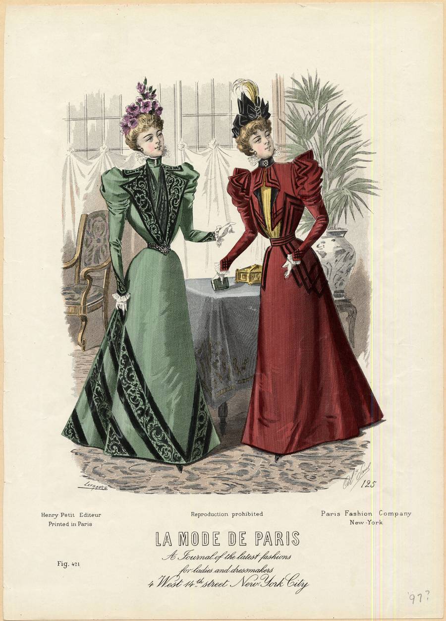 Two women are standing in an elegant room. The woman on the left is in a high-collared light olive green dress with small leg o’ mutton sleeves. Her dress has black floral pattern bands across the skirt in diagonals. The same black pattern forms the lapels of the bodice,and a v shaped decorations at the wrists.