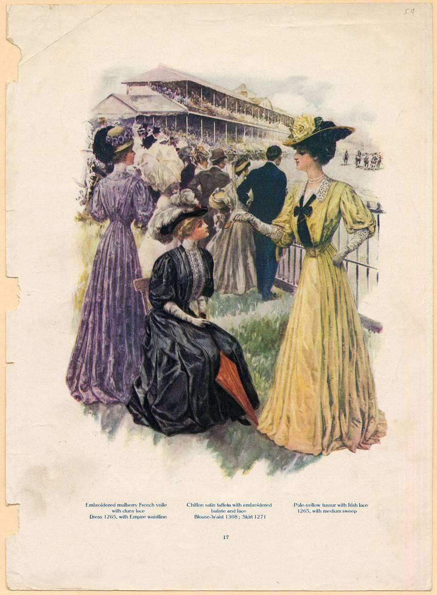 The artist draws the viewer’s attention to the blond female in the center with her bright red parasol. The long, covered seating structure along the race-track lends an illusion of depth. The woman at the left has her back turned to the viewer and wears a gown of mulberry embroidered French voile decorated with Cluny lace. Her dress has a high collar of white lace, softly gathered sleeves, and a back waistline in a raised v.
