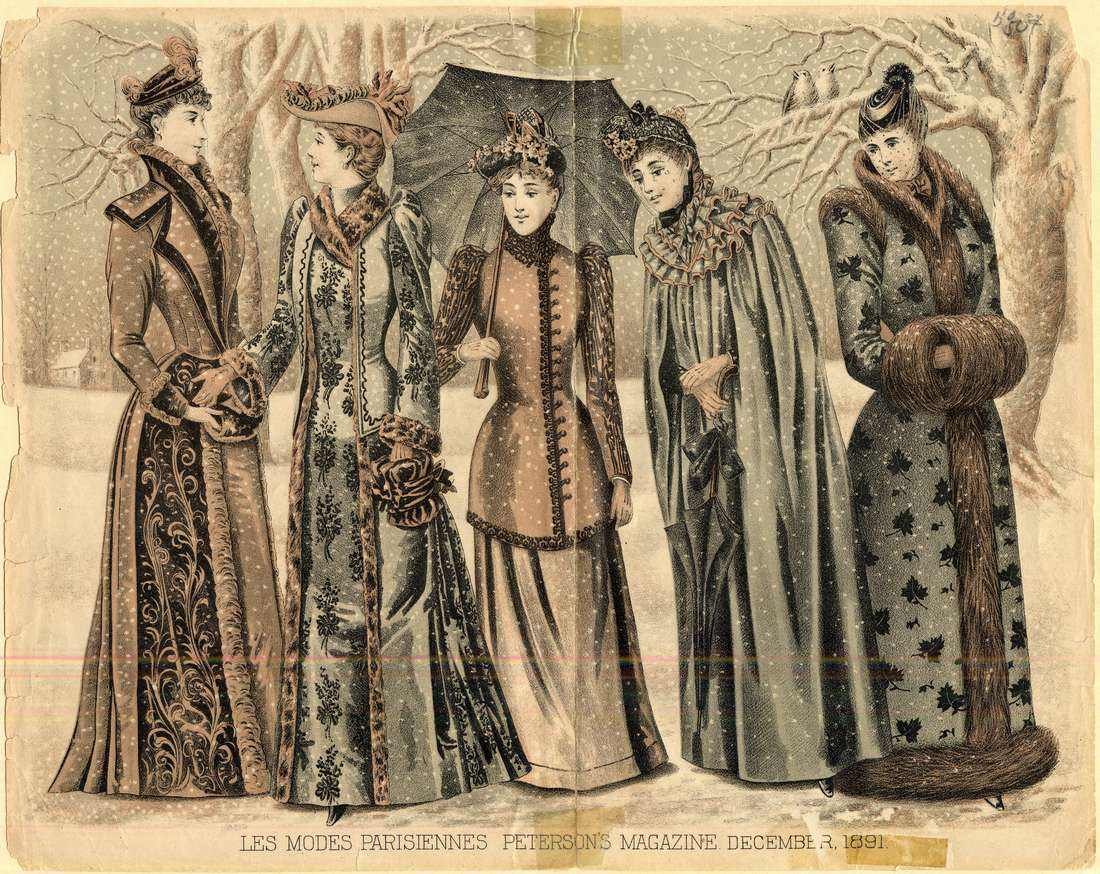 She carries a small brown velvet muff, and wears small oval gold pendant earrings. The woman second from the left is wearing a light green or gray princess line dress with a black floral design on the sleeves and skirt. The collar is brown fur, and the front edges and cuffs are also trimmed in brown fur. She wears tan gloves and holds a small brown muff trimmed with bows. She wears a tan hat with a turned up brim trimmed with fur and feathers, and wears small oval gold pendant earrings.