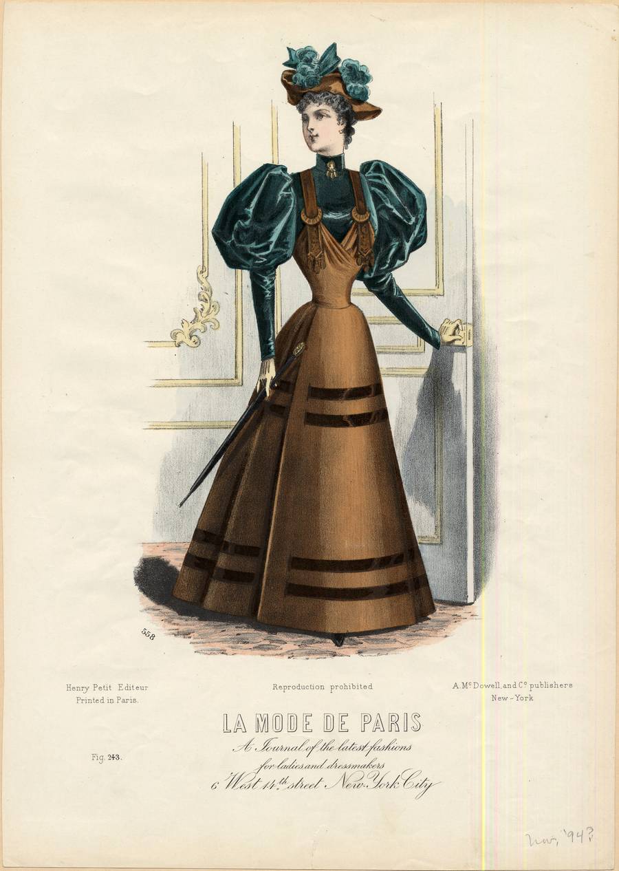 A woman stands reaching toward a door. She is wearing a dark green and tan outfit with large leg o’ mutton sleeves. The deep green blouse has a high standing collar, with a small cameo brooch with three pendants at the center front. The sleeves are very wide and full, with the lowere sleeves fitted tightly to just at the elbow. Over this her dress is tan with a fitted bodice with a v neck, The shoulders are narrow brown straps passing through two circles just above the bust line.