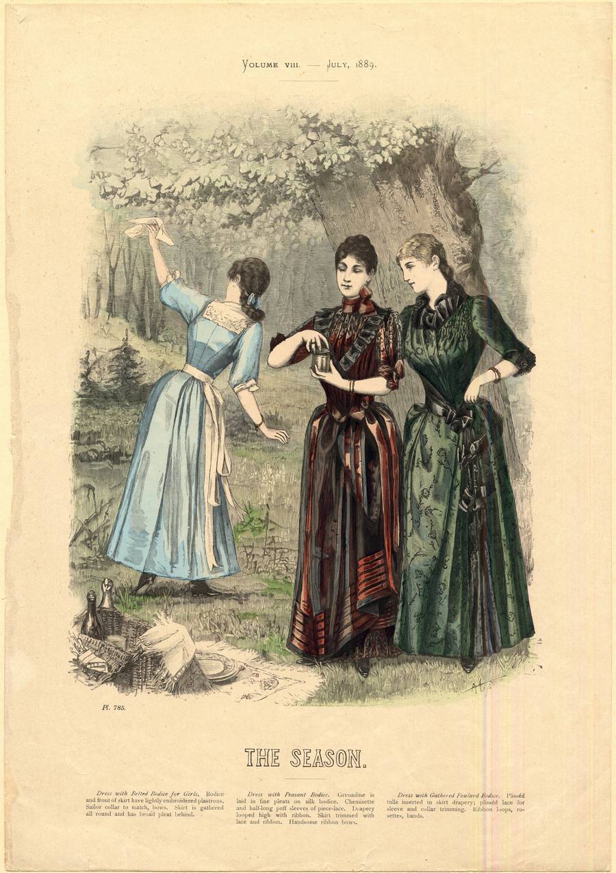 Two women and a girl stand on grass before dense trees to have a picnic. The girl on the left faces away and waves her handkerchief. She is wearing a light blue dress with princess seaming, a white square collar trimmed with lace, and a long white ribbon sash tied in a large bow hanging almost to the hem of her skirt. Her sleeves come just below her elbows, are full, and have ribbon bows at the elbows. Her hair is pulled back into a blue bow at her neck, and she wears a gold bangle bracelet with a pendant Her skirt is ankle length, and she wears black boots with low heels.