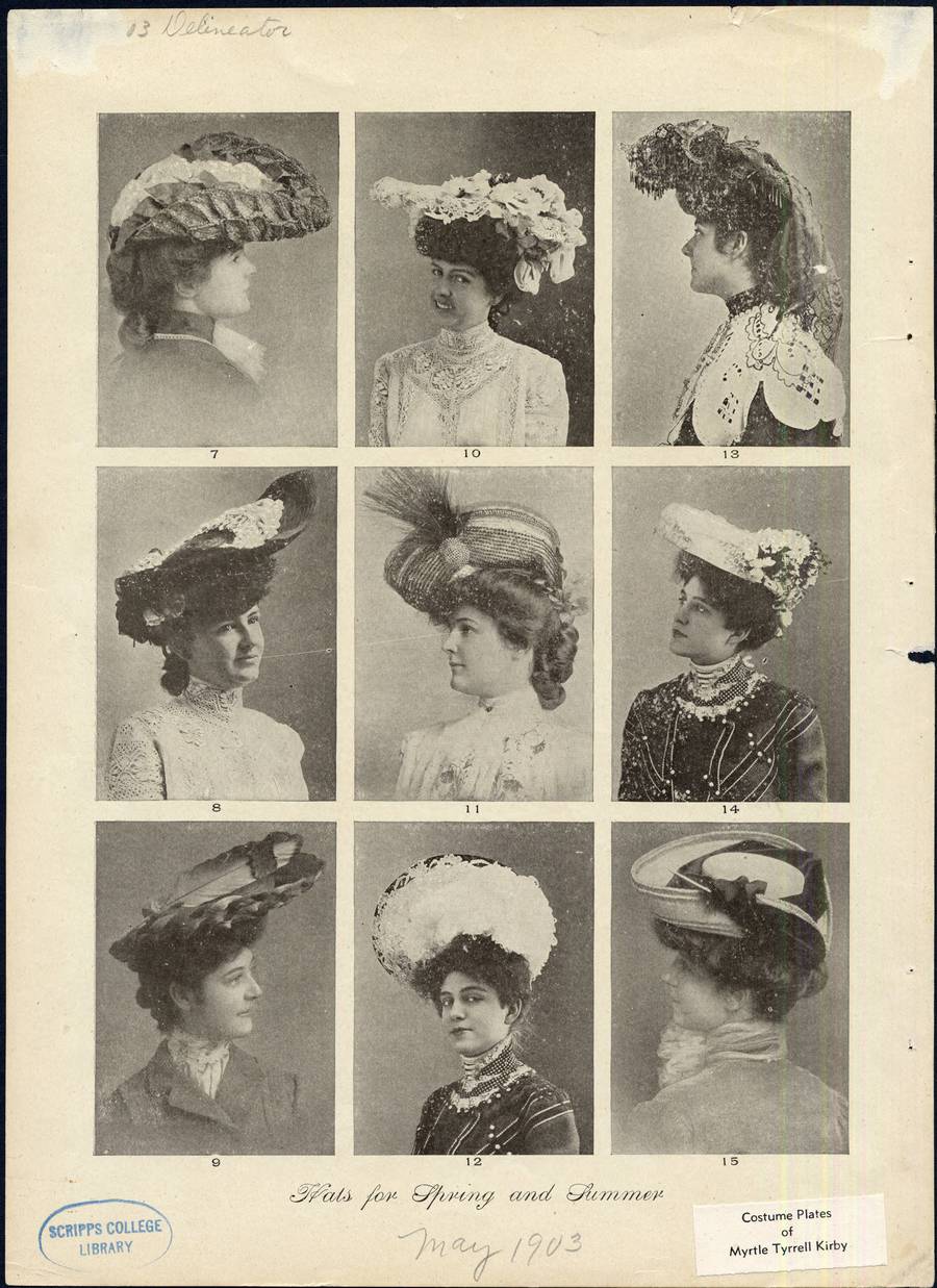 Nine black and white photographs of women numbered 7 through 15 model a variety of hats for Spring. Woman number 7, in the upper left, wears a dark dress with a white jabot. Her hat is covered with overlapping rows of leaves, Below her, woman number 8 wears a high necked white lace dress and has a dark straw flat-brimmed hat, adorned with white on the crown, and roses under the left side of the brim. Woman 9 wears a dark jacket over a white lace high necked blouse.