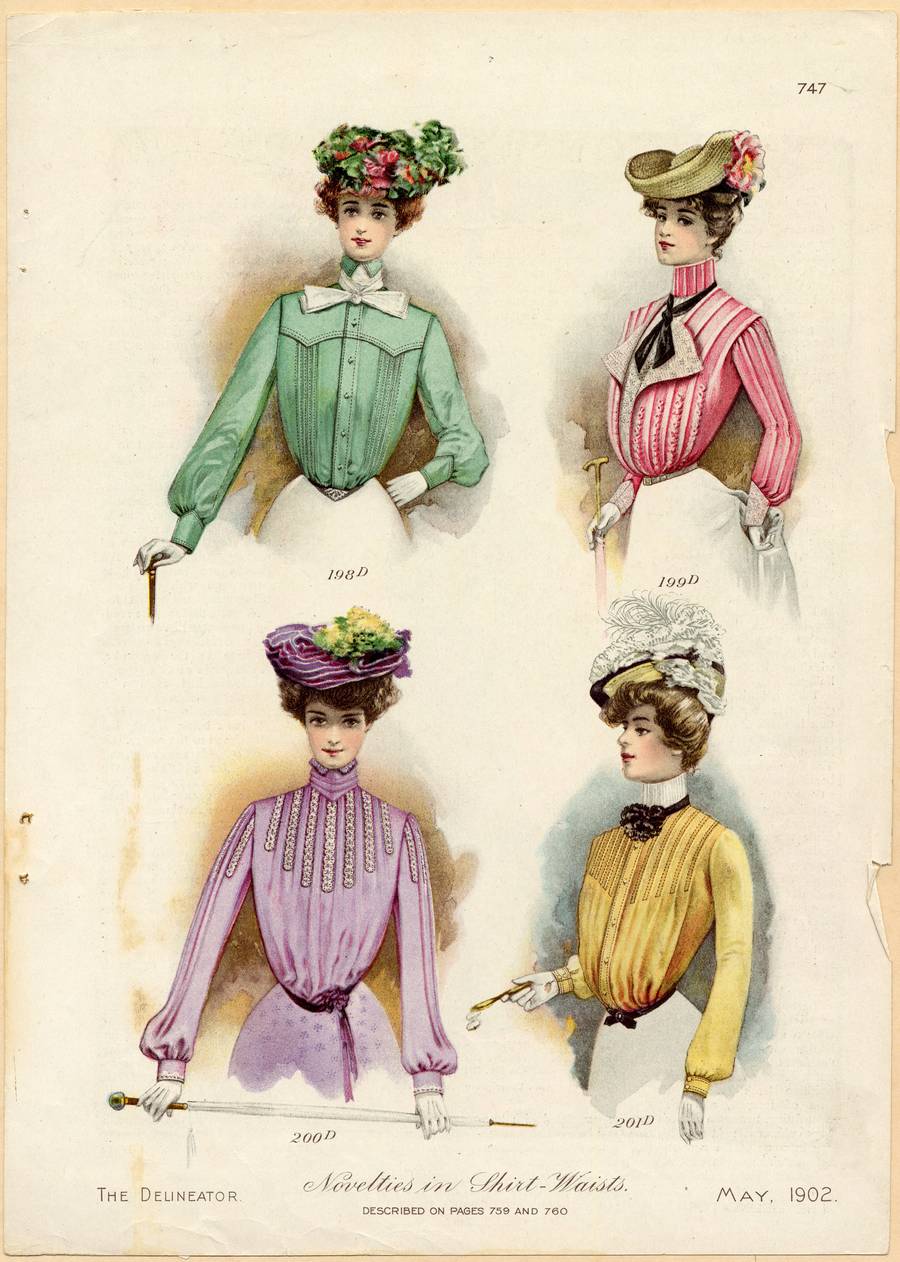 The torsos of four women display their American shirt-waist fashions, all with masculine-inspired elements. The woman in the upper left wears a is pale green blouse with a front button fastening, a very high turnover collar, and long sleeves. The bodice a has shaped yoke, with slight points, above sections of five small top-stitched pleats on each side. The cuffs are also pointed to match, and the sleeves are full and are gathered into the cuffs. All sections are top-stitched, with double rows of stitching on the yoke, cuffs, and collar. She wears a white cravat tied into a wide stiffened bow.