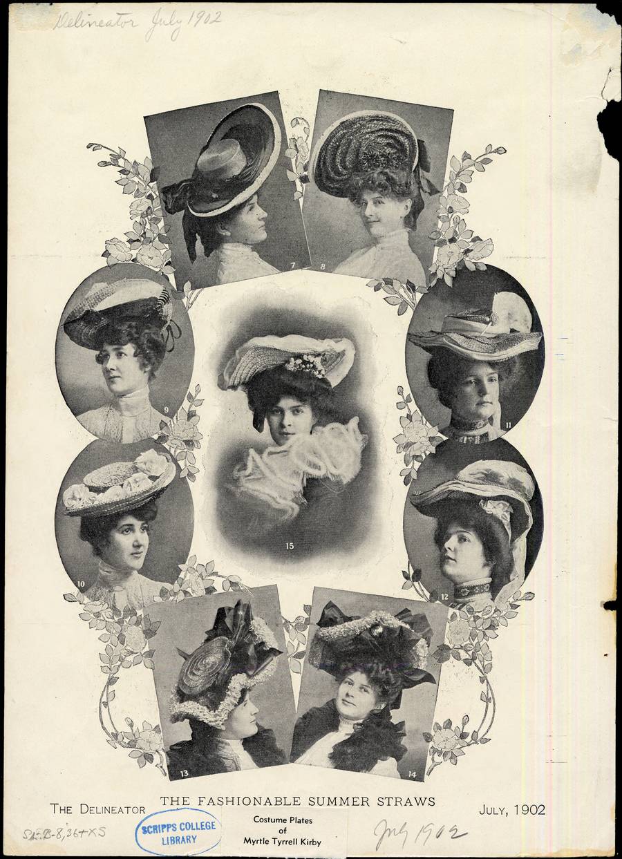 On this black and white page of The Delineator, nine women display views of fashionable summer straw hats. The grouping of photographs, some square, some oval, and numbered 7 through 15, are composed in a garland around one woman in the center who faces directly out at the viewer.