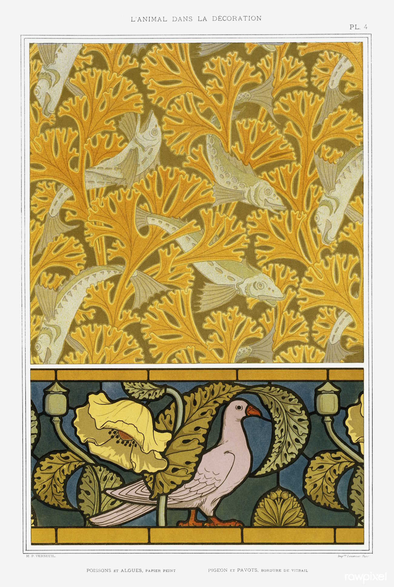 Chromolithographic patterns from L’animal dans la Décoration (1897) by Maurice Pillard Verneuil(1869–1942), French artist and decorator in the Art Nouveau and Art Deco movement.