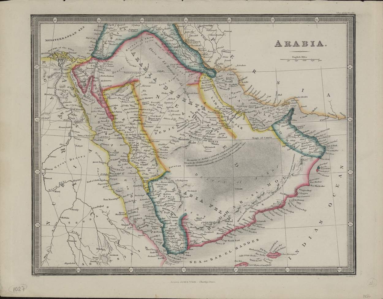 This map of the Arabian Peninsula appeared in the 1856 edition of the world atlas that was first published by James Wyld (1790-1836) in 1824 and in successive editions by his son, James Wyld the younger (1812-87). Political divisions are indicated by colored lines and the scale is in English miles. Cities, towns, wells, and caravan routes to Mecca are shown.