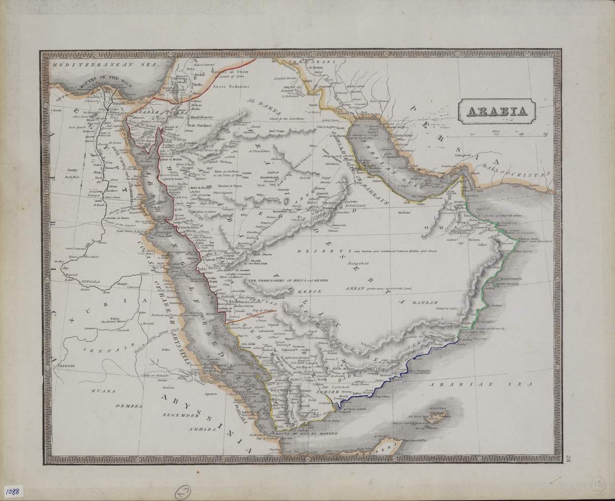 The map emphasizes the vast, empty interior of the peninsula with such annotations as “great space covered with sand” and “deserts very barren and continued between Mekka and Oman.” Four different caravan routes for pilgrims to the city of Mecca are shown: the Damascus route from the north; the Turkish and African route across the Sinai Peninsula; the Persian route to the northeast; and the Indian route to a port on the Persian Gulf. The locations of water wells along the Persian and Indian caravan routes are indicated.