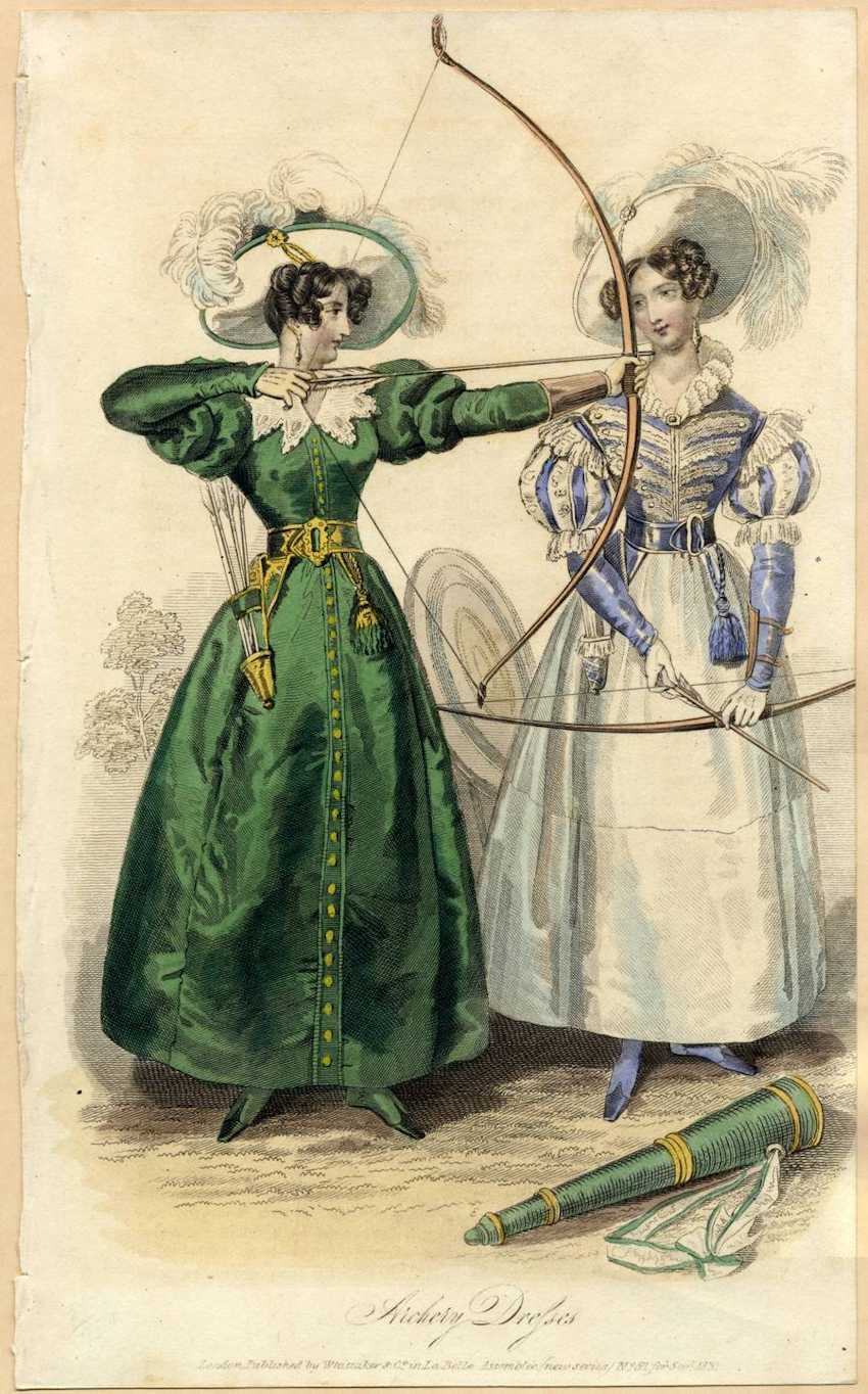 It is adorned with several large white plumes at the crown and a golden ornament at the brim. The woman wears long dangling earrings, green boots, pale gloves, and a brown bracer, or arm-guard, on her left forearm. She holds a bow and arrow ready to shoot. The woman on the right wears a blue and white archery dress with a high, lacy collar and a short, sheer apron.