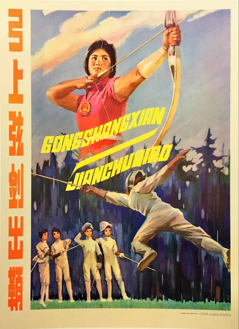 The poster he submitted is titled “Bow on the string, sword out of the sheath.” The image features central elements highlighting the sport and patriotism of the time: a female archer occupies the top of the image, displaying the Chinese national emblem on her uniform. Below her, several fencers are depicted in action, symbolizing agility and readiness.