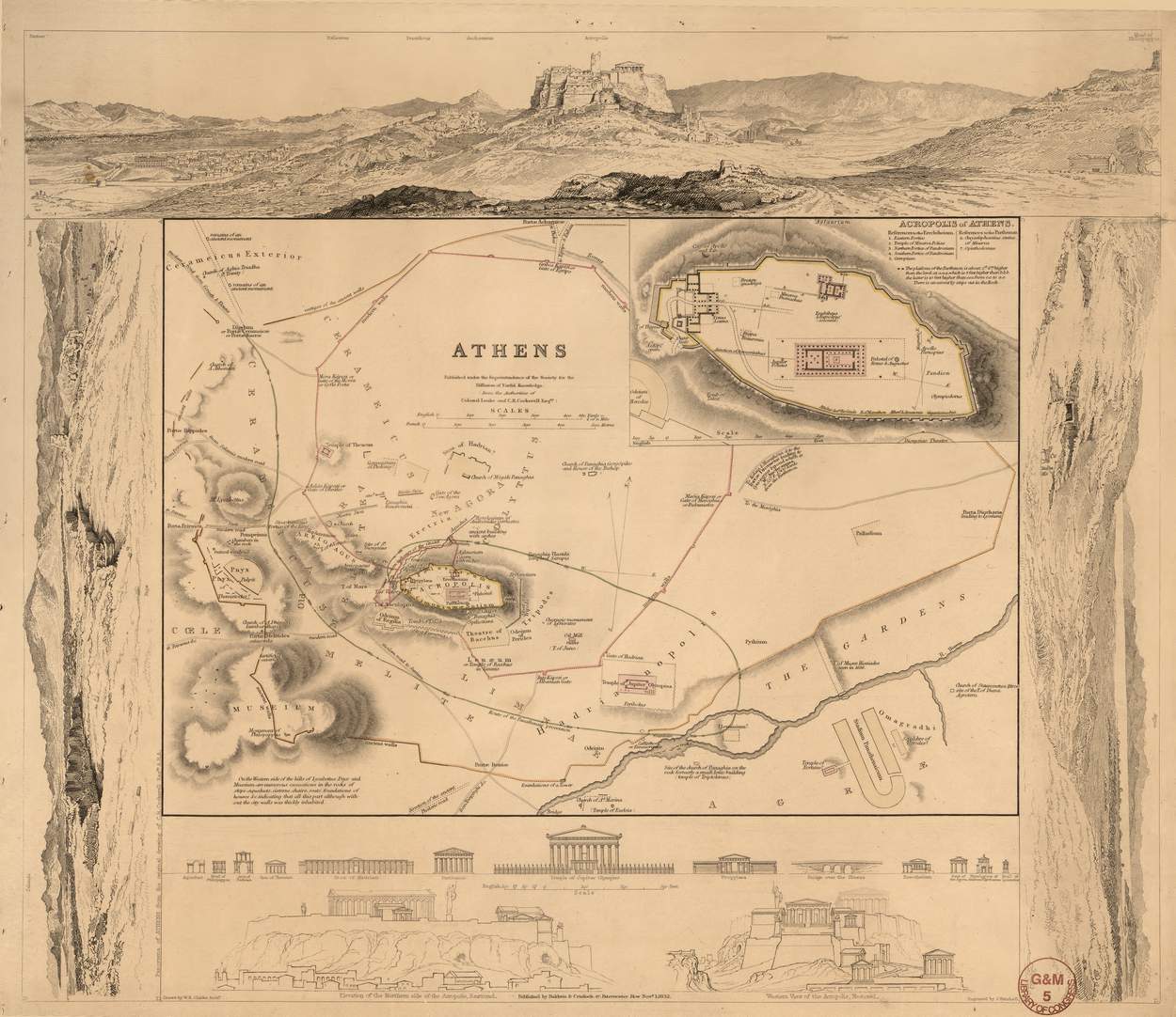 - Includes notes, inset of “Acropolis of Athens”, a ground-level “Panorama of Athens from the original drawing of C.R. Cockerell Esq’re A.R.A.” in 3 segments in the left/top/right-hand margins, 2 ground-level views of the Acropolis (in its original form), and ill. of principal buildings (in their original forms) in the lower margin.
