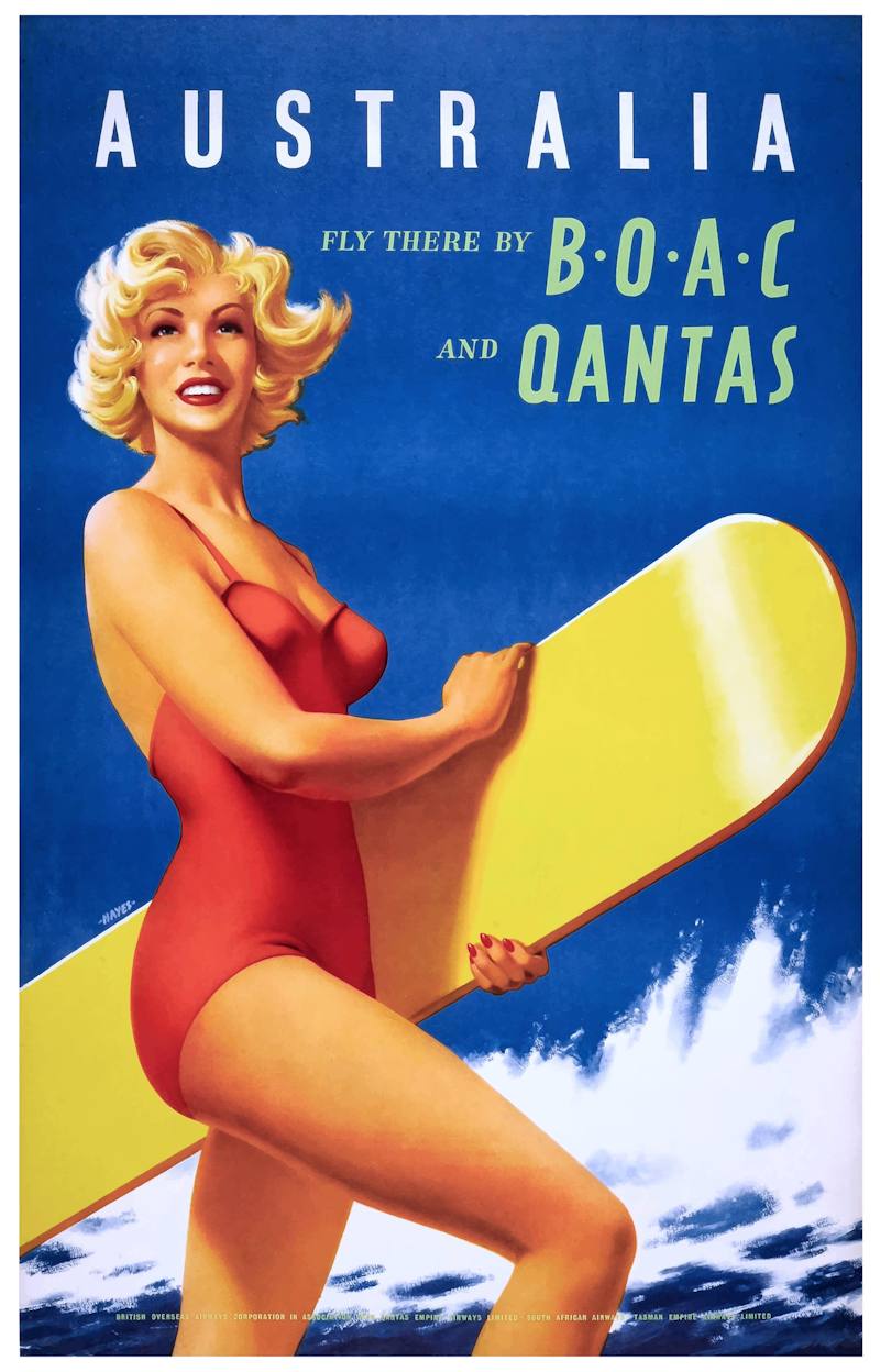 Historical Context – Created around 1955 or 1956, the poster captures the “pin-up” aesthetic of the time to promote the sunny beaches and surf culture in Australia.