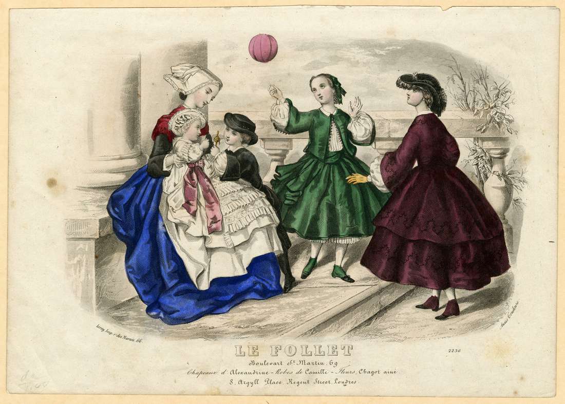 The bonnet looks somewhat like a nun’s ‘coronette’ except for the lace edging. She may be the child’s nurse in a traditional bonnet. A young boy gets the attention of the baby with a gold baby rattle. He wears a black short trouser suit with wide turned back cuffs with buttons, over a white full sleeved blouse. He has black stockings and shoes. His black, low-crowned, narrow-brimmed hat matches the outfit. The girl in the center wears a knee length very full green skirt and jacket, over a white petticoat and white full sleeved blouse.