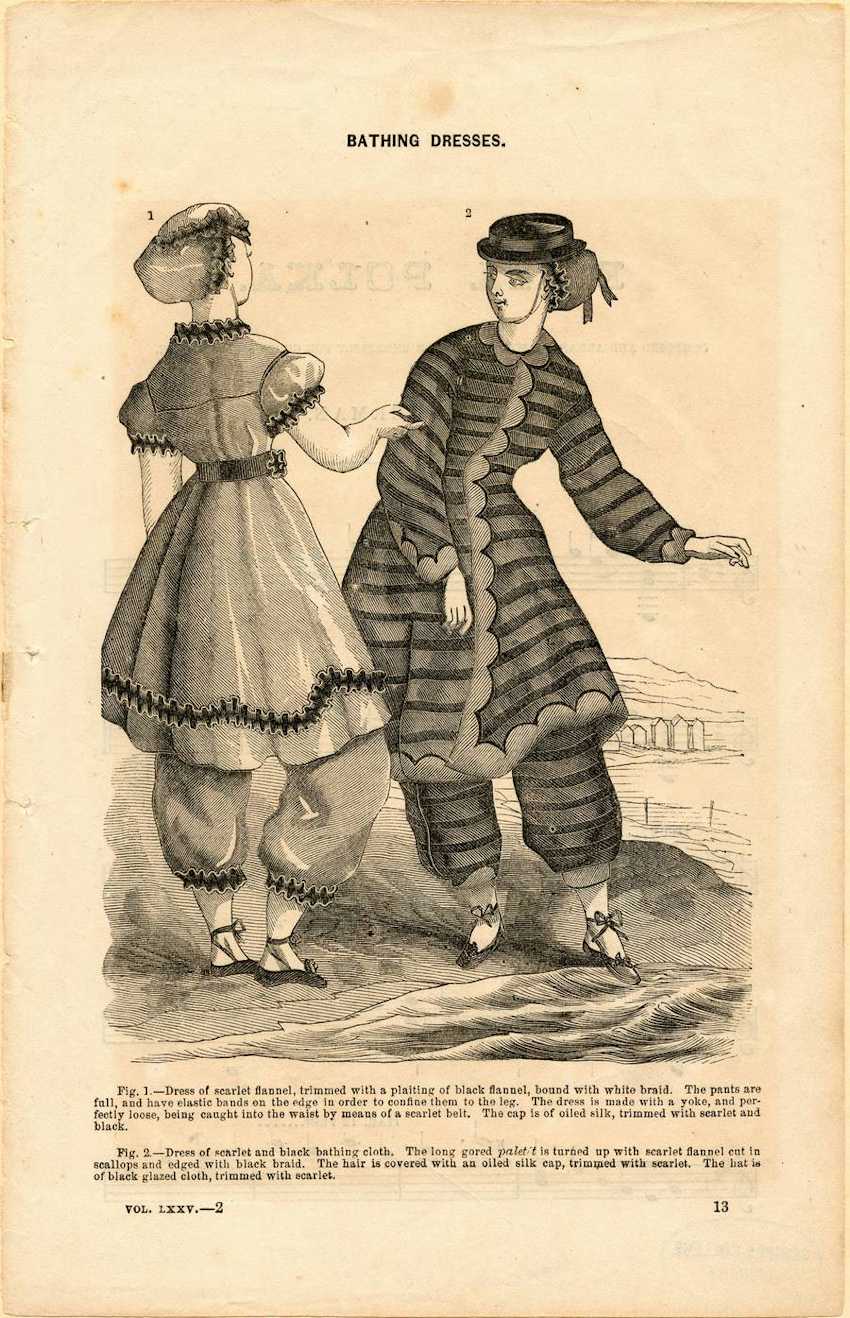 Two women are depicted on the beach wearing bathing dresses. The woman on the left faces away from the audience. She wears a light gray bonnet with black ruffle around the edges. Her dress is a matching gray and ends just above the knee. She has black ruffles around the collar, sleeves, and hem of the skirt.
