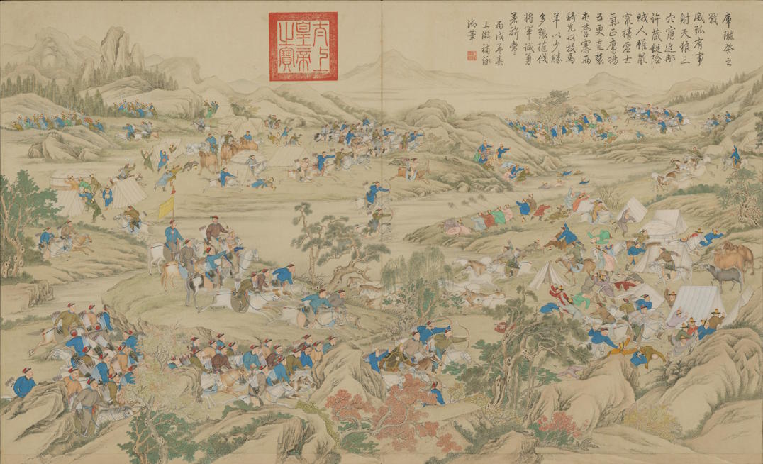 “The Battle of Kulonggui” from “Pictures of Victory in the Subjugation of the Zunghar and Hui Tribes” by Emperor Qianlong of the Qing Dynasty. It depicts Zhao Hui’s victory over Amursana at Mount Kulonggui (present-day East Almaty, Kazakhstan). The painting features a poem inscribed by Emperor Qianlong.