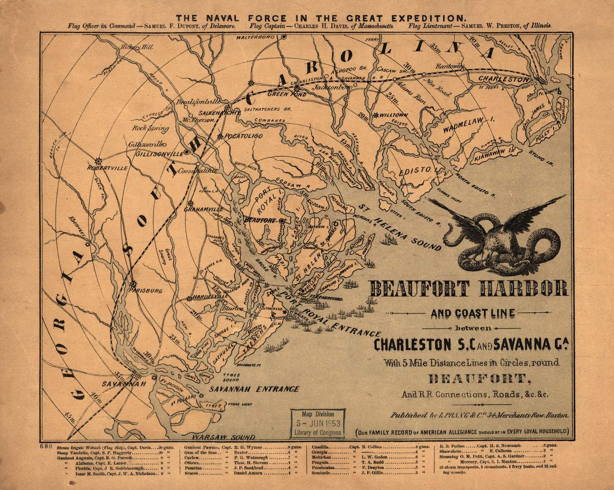 Scale not given. LC Civil War Maps (2nd ed.), 368a Indicates ships in Beaufort Harbor and a few of the line coastal forts. “The naval force in the great expedition” appears above the map, followed by the names of commanding officers. Below the neat line at the bottom of the map appear the names of the ships, the captains, and the number of guns aboard each ship.