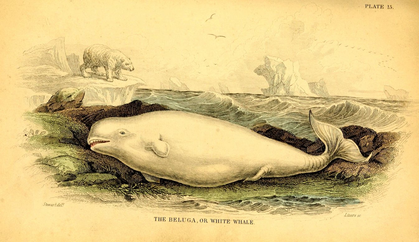 This image is part of a collection of whale drawings that appeared in the 1843 book “Whales” by Roger Hamilton.
