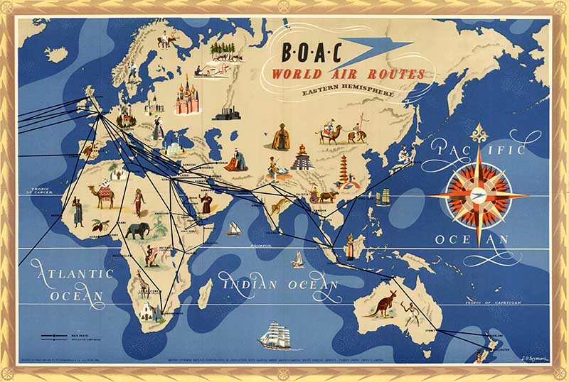 Vintage travel advertising poster from the British Overseas Airways Corporation (BOAC), titled “B.O.A.C. World Air Routes Eastern Hemisphere”.