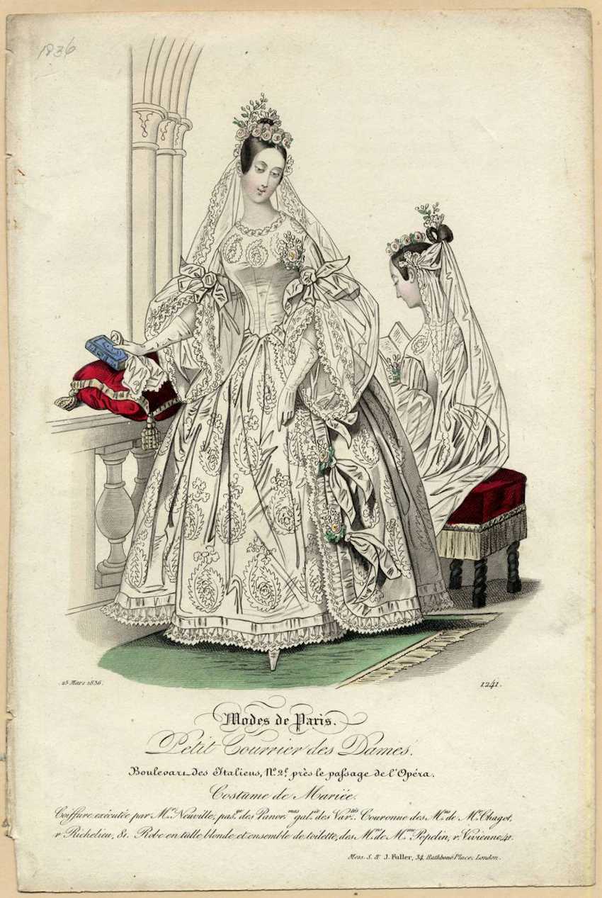 The woman on the left wears a white wedding dress with a high, round neck, a fitted bodice, and a divided overskirt that shows off her ornately patterned underskirt. Both skirts are edged with white, lacy ruffles and patterned with tone-on-tone floral motifs. The vertical edges of the overskirt are trimmed with corsages of pink and white flowers and knots of white ribbon. The sleeves are fitted to the elbow, with lace lower sleeves which form a wide bell. The bells of the sleeves are divided and caught up by elaborate knots of white ribbon at the elbow.