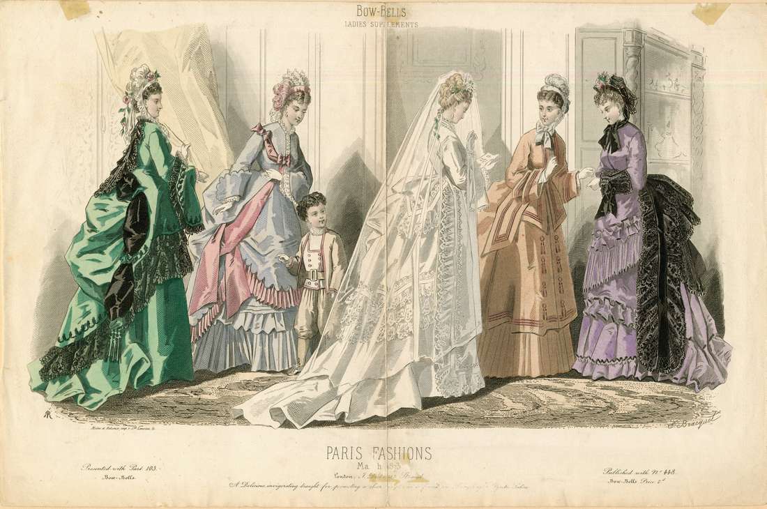 Four women, a small boy, and a bride are depicted standing in a parlor. The woman on the far left wears a white bonnet with white plumes and pink flowers and white lace ties. At the back of the hat is a short white veil with a garland of flowers hanging down over it. Her dress is green with black lace trim, wide sleeves, and coiled black accents on the sleeves and skirt.