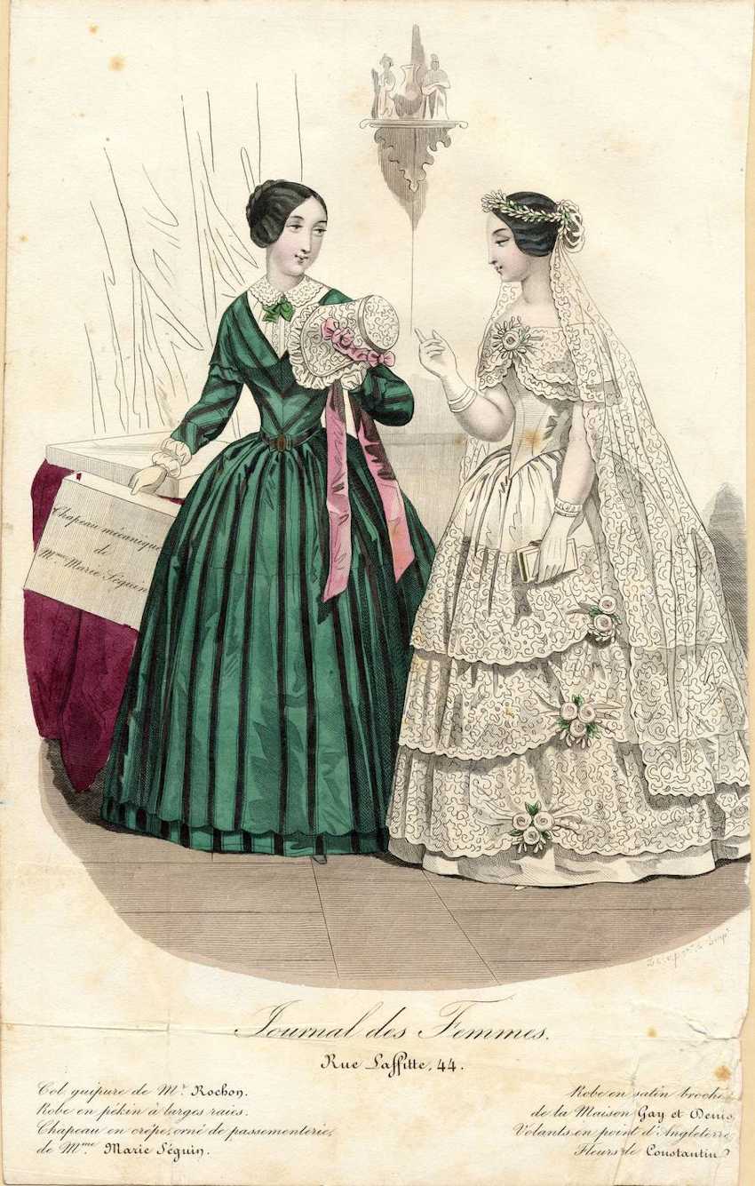 Two women stand in a room. The woman on the left wears a forest green gown with black stripes in a “V” shape on the bodice and long sleeves. Vertical stripes run down the length of the skirt. She wears a white blouse with a lace collar and small green bow at the neck. She holds a white lace bonnet with ruffles and pink flowers and ribbons in her left hand, and a placard with the designer’s name in her right hand. The woman on the right is dressed in an elaborate white wedding gown with a large off the shoulder lace collar.