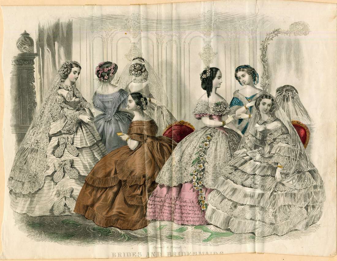 Seven women are depicted, three brides and four bridesmaids. The bride on the left wears her hair up and looped over her ears. Her white lace veil is attached with a coronet of white flowers and ends about a foot above the floor. Her dress has a jewel neck, a white lace collar, with a wide lace bow. She sleeves are long bells and her skirt has three tiers. Each tier is decorated with a large bow on the side and a series of horizontal pintucks.