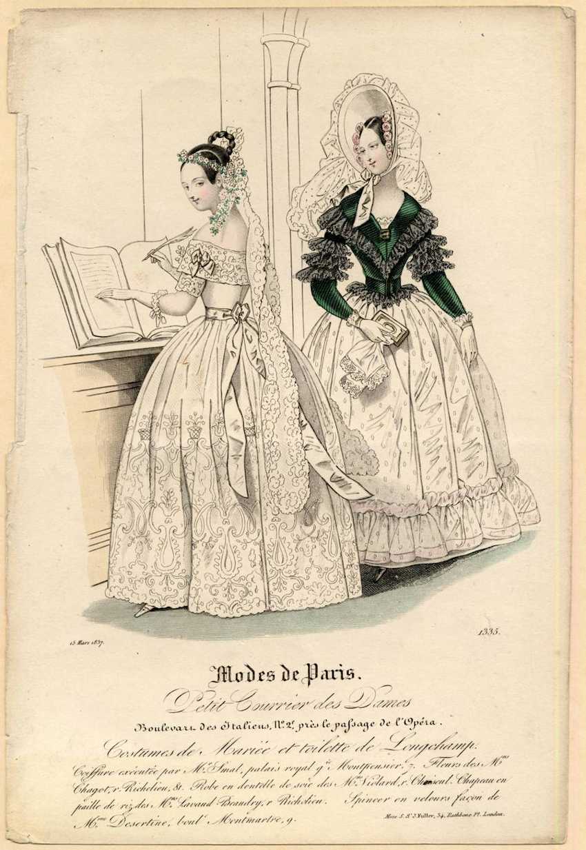 The woman wears white shoes and long gloves and has a corsage pinned to her bodice. Instead of a veil, she wears a circlet of pink flowers. Her coiffure is ornamented with a spray of pink and white flowers and two long, white lace streamers. Using a feather pen, the woman signs a large book. Her companion wears a white dress with bell-shaped skirts edged in pink and trimmed with a deep flounce. She wears a short, dark green jacket over her dress. The jacket has a v-neck trimmed with black lace and three tiers of black lace ruffles above the elbow.
