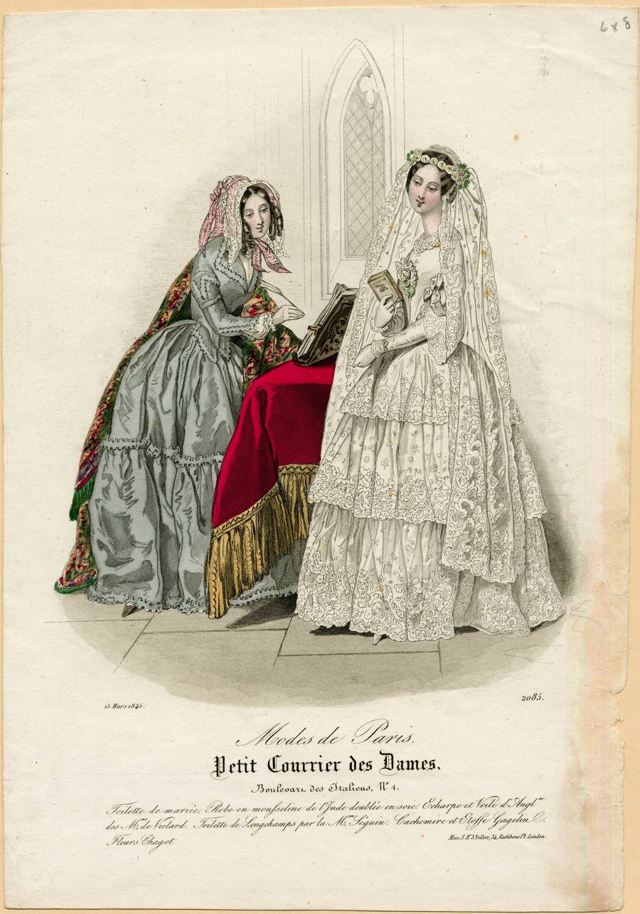 She writes with a quill in an open book that rests on a stand on a table. The book seems to have a gold clasp, and tooled binding, and the table is covered with a red cloth edged with wide gold fringe. She may be signing the parish register as a witness to the wedding. The woman on the right is in a wedding dress and veil, and holds a prayer book or small Bible. Her dress is made of white lace with a small floral print and scalloped borders.