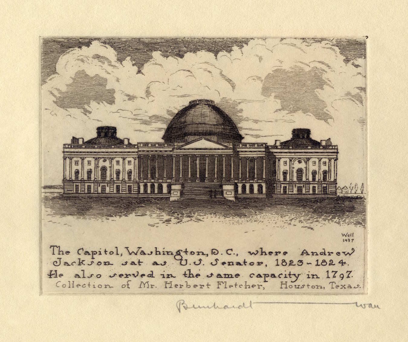 A pen and ink drawing of the United States Capitol building in Washington D.C. The drawing shows both houses of Congress and the rotunda before the dome was built. The caption reads: “The Capitol, Washington D.C. where Andrew Jackson sat as U.S. Senator, 1823-1824. He also served in the same capacity in 1797”.