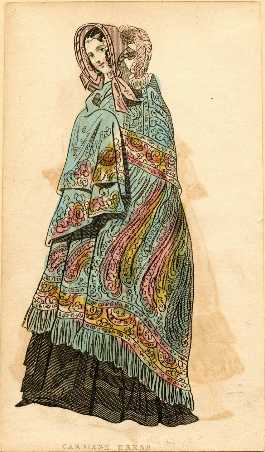 Woman wears a pink bonnet with a large feather plume and bias striped edging. She wears a filet on her brow. Her dress is black with two wide stripes of netting at the hem and center front, and is covered by a large multi-colored shawl. The shawl is light blue with pink, yellow, and white in the paisley and floral pattern, and has wide fringe edging the hem.