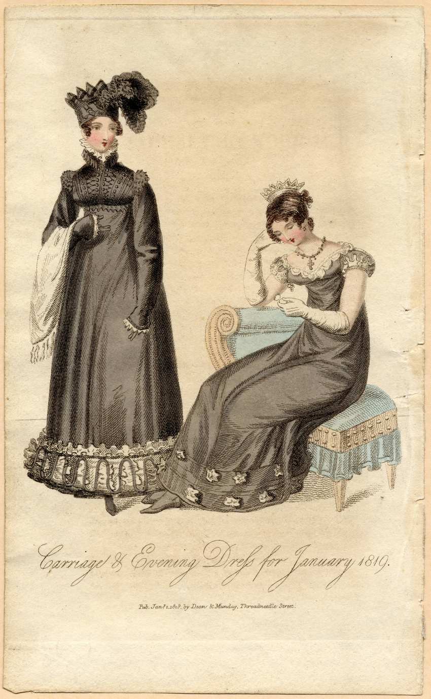Woman on the left wears a gray carriage dress with long sleeves, a high collar, and an empire waist. The cuffs are edged with white lace and trimmed with gray frog closures. The bodice is trimmed with vertical lines of gray buttons, gray ribbon, and gray zigzag designs. A gray ruffle runs under the bust, and there are gray ruffles at the shoulders.