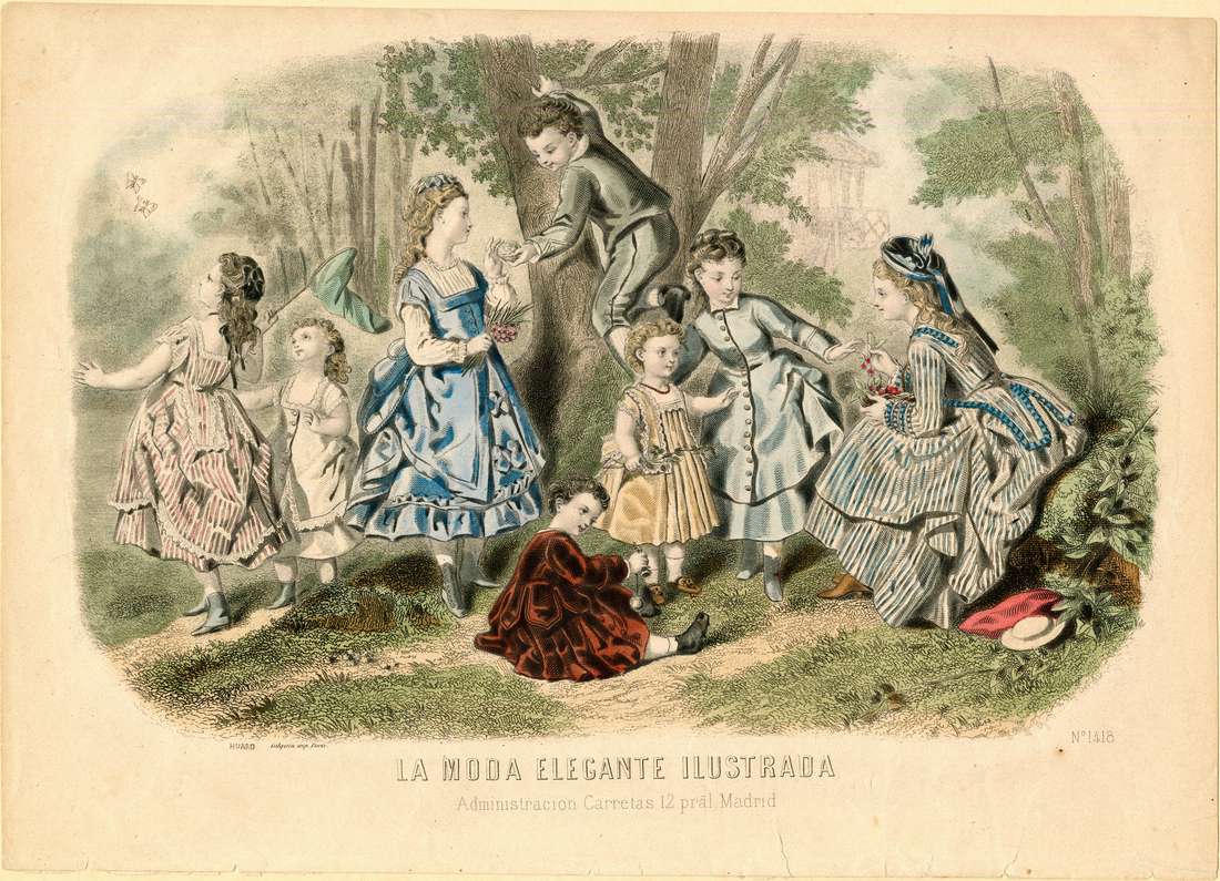 Eight children are depicted playing in a garden. All the girls dresses have calf length skirts. The girl on the farthest left wears her hair half up, tied with a black ribbon. She wears a black choker and a white and pink striped dress with a wide square neckline and material gathered up at the back. She wears gray ankle boots and holds a butterfly net in her right hand. Next to her is a younger girl who is watching her attempt to catch butterflies.