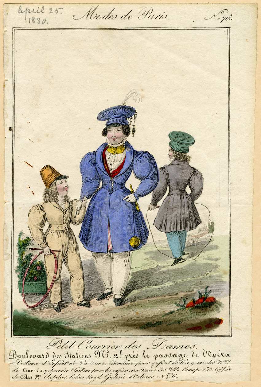 Three French boys play with outdoor toys in 1830. The oldest child in the center wears white strapped peg top trousers and a tight-waisted blue frock coat with leg o’ mutton sleeves. The coat is lined with diagonal red and white stripes, which just shows at the front of the hem. Underneath the coat is a red vest or waistcoat and a white pleated, embroidered shirt with a ruffled collar. The collar is tied with a wide yellow cravat.