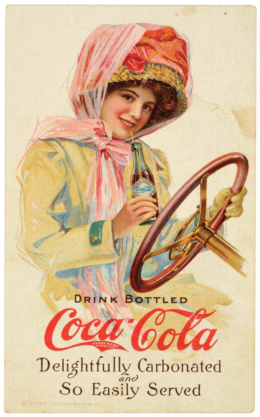 Vintage Coca-Cola advertising postcard. The image features the “Motor Girl,” a popular character in the brand’s campaigns in the early 20th century.