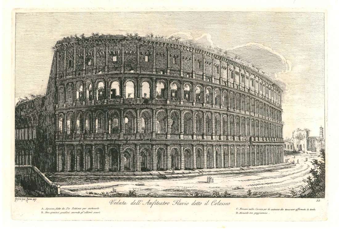 The engraving presents a detailed external view of the Colosseum, highlighting its three orders of arcades and the upper attic, as well as showing the state of conservation of the monument at the beginning of the 19th century, before the major modern restorations.