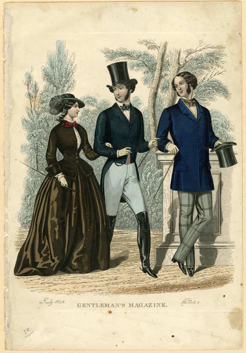 She holds the arm of the man in the center who wears gray trousers, a white pleated shirt, a short tan waistcoat and a green cutaway tail coat with notched lapels. We see the chain of a pocket watch hanging from his coat. His shirt has a stiff collar and he wears a blue cravat tied into a bow. His tall black riding boots are polished leather and reach above his knees; the heels of his boots have spurs. He wears a tall black top hat, carries a riding crop, and he wears long sideburns.
